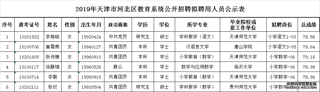 附:2019年天津市河北区教育系统公开招聘拟聘用人员公示表