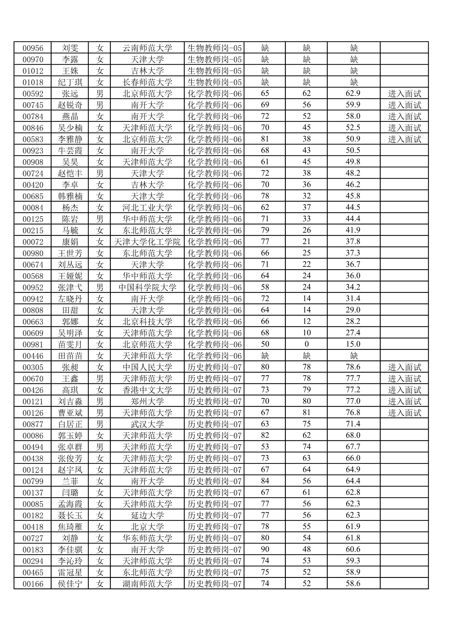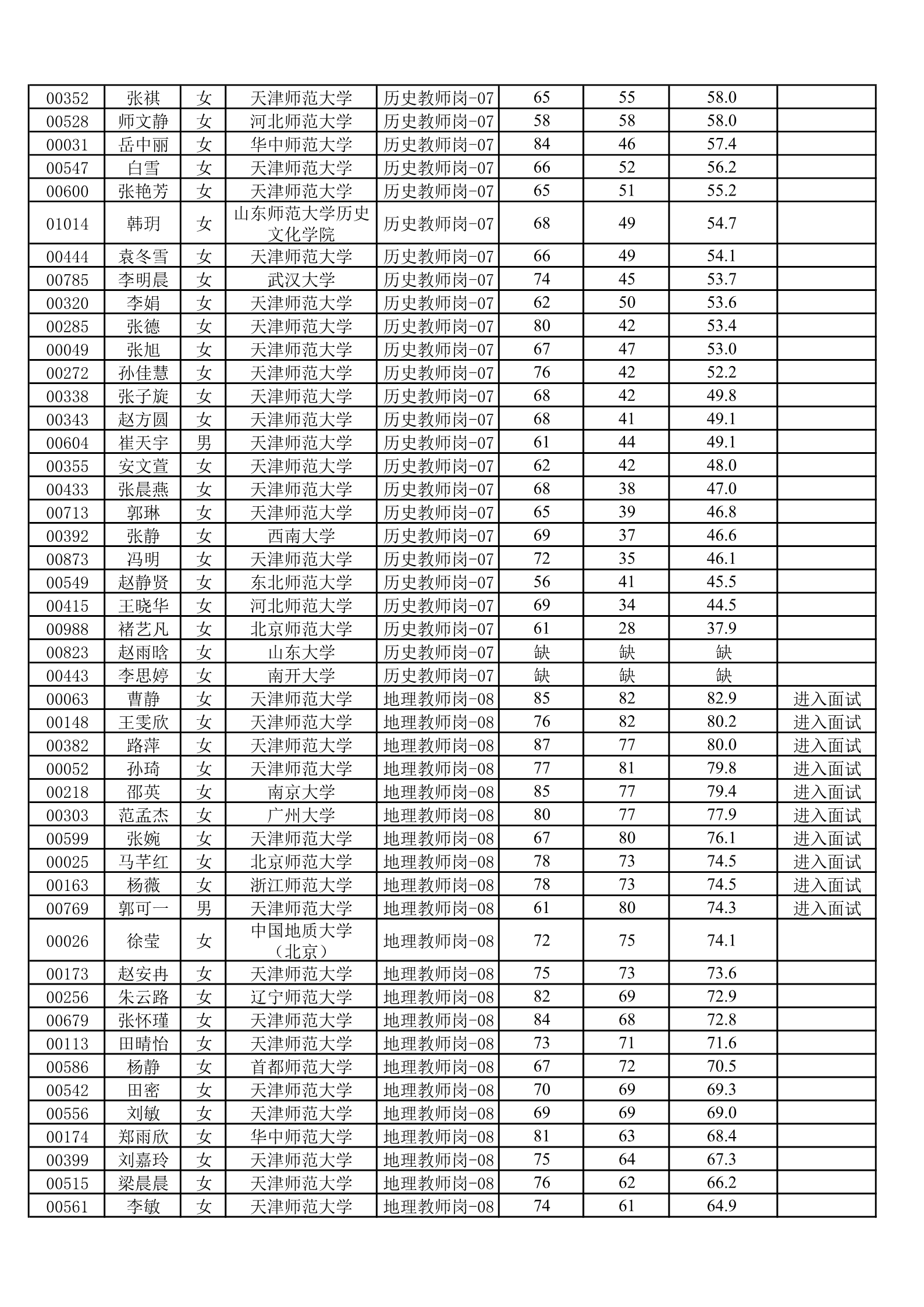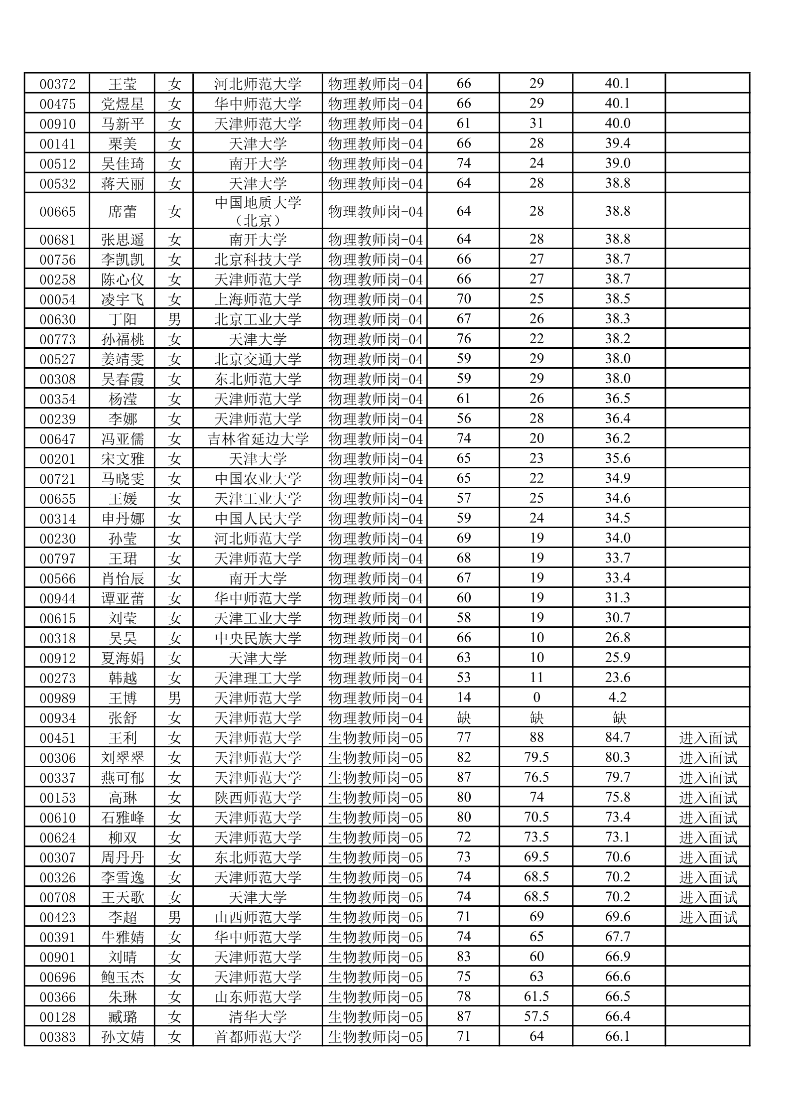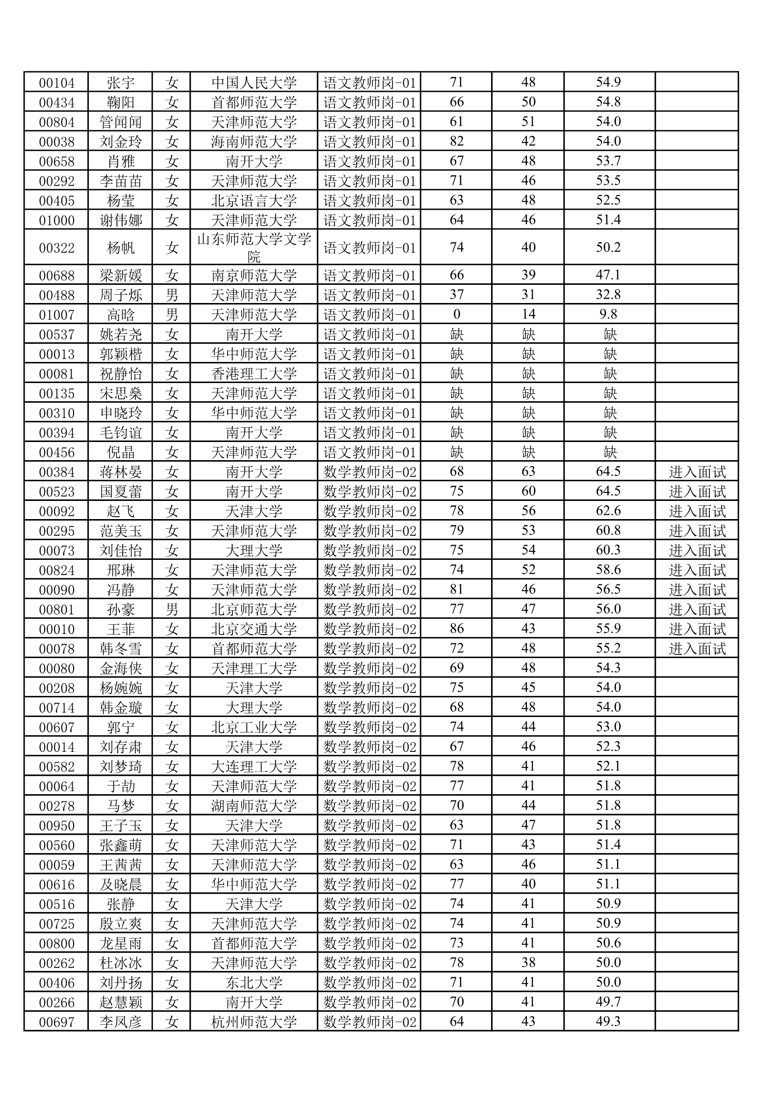 天津一中2020年公开招聘笔试成绩公示