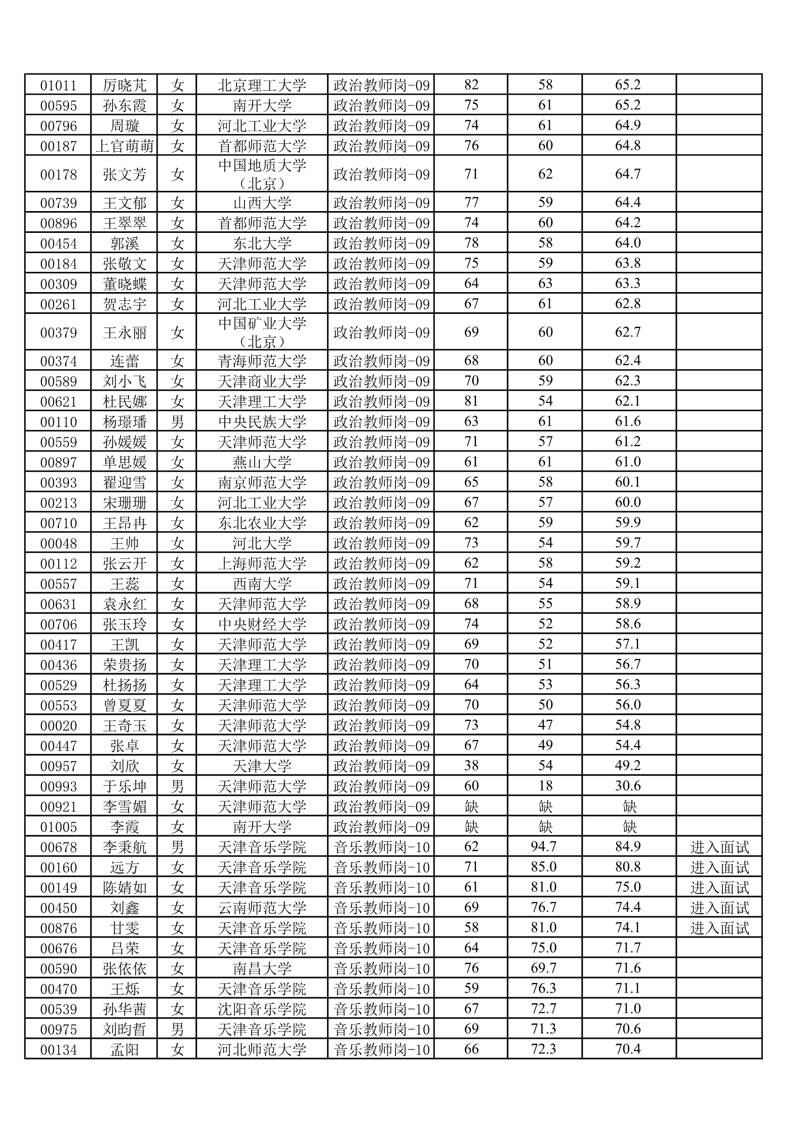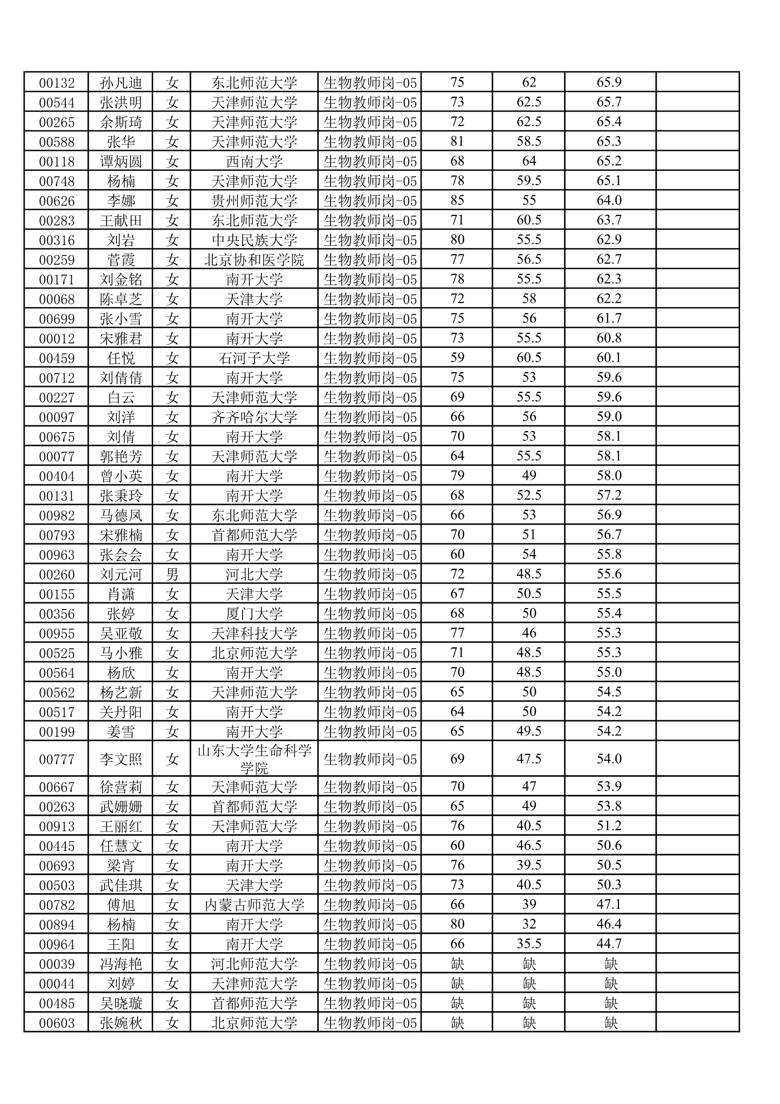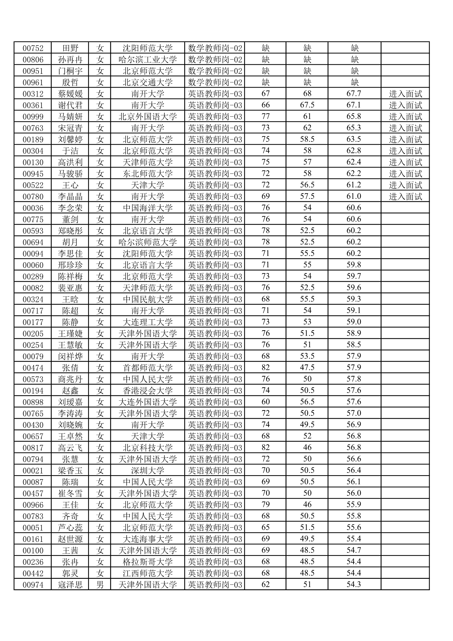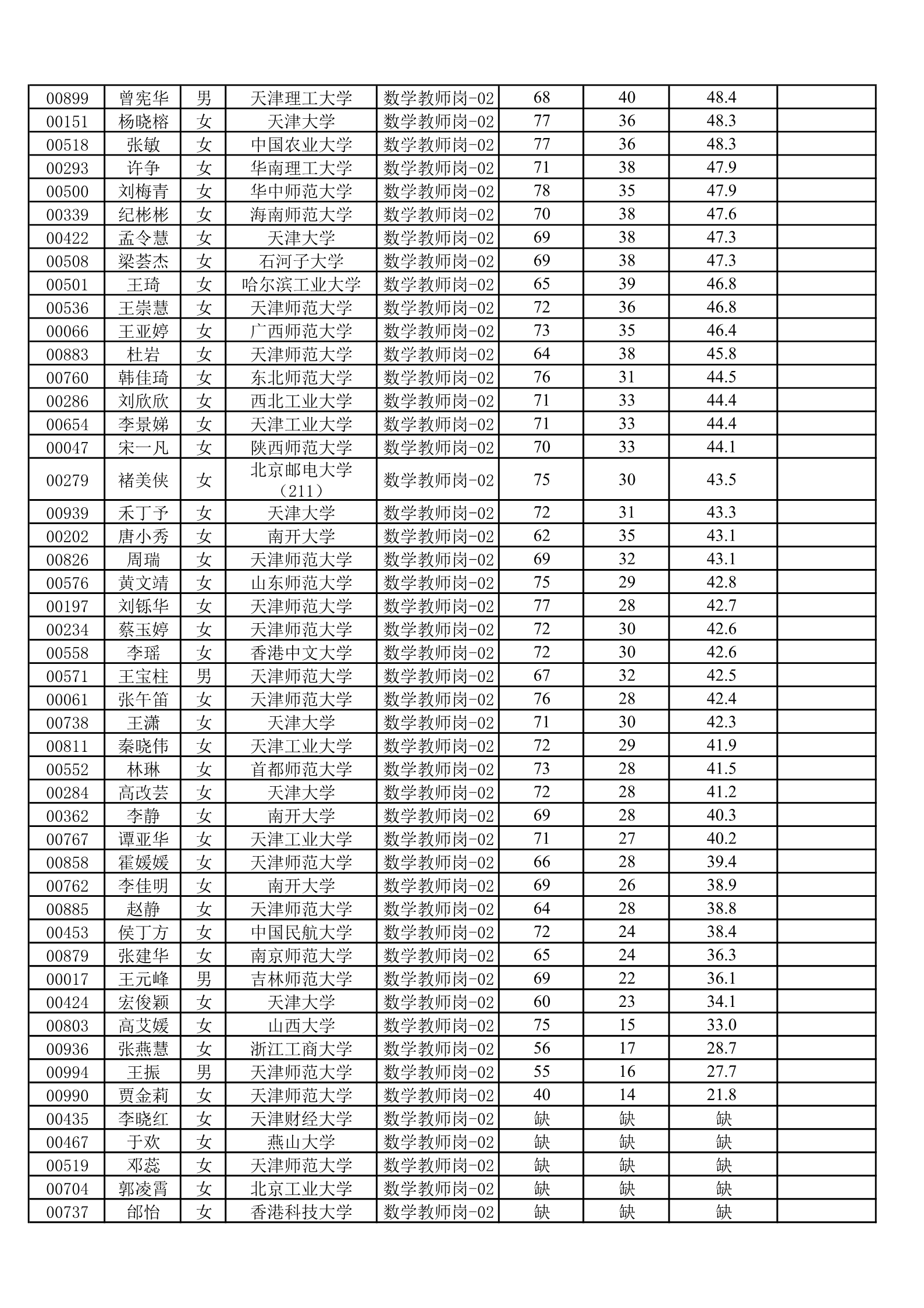 天津一中2020年公开招聘笔试成绩公示