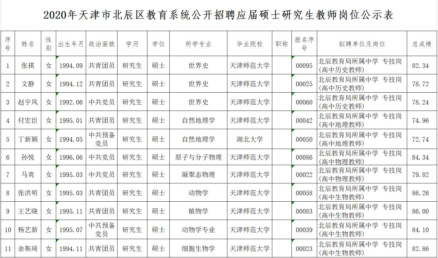 2020年天津市北辰区教育系统公开招聘 应届硕士研究生教师拟聘用人员公示