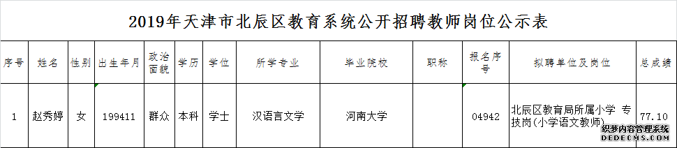 2019年天津市北辰区教育系统公开招聘工作人员拟聘用人员公示