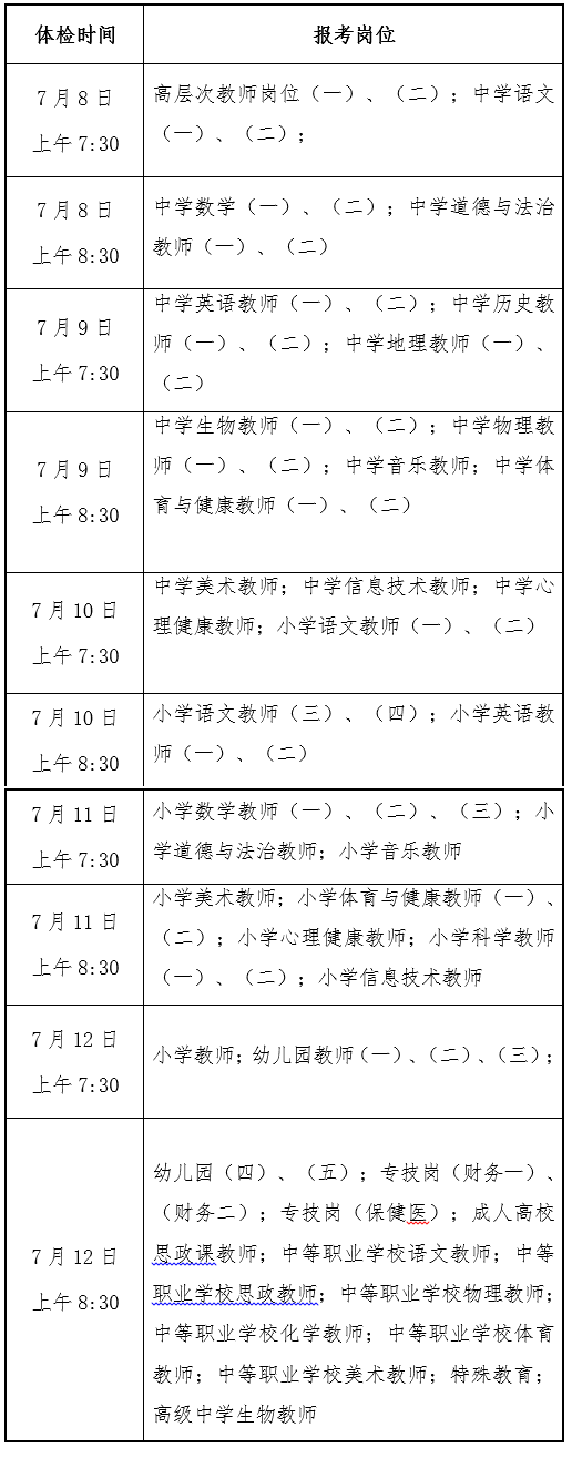 一、体检时间:2024年7月8日、7月9日、7月10日、7月11日、7月12日(职位安排见后表)