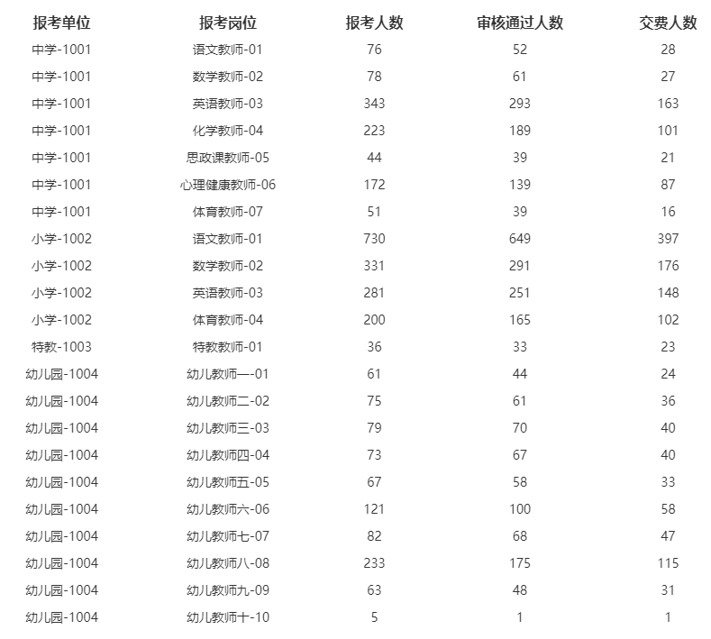 天津市东丽区2021年公开招聘教师报考情况统计 (统计时间:2021年7月2日上午10点为最后一次报考情况统计)