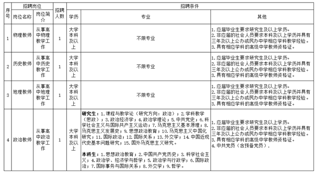 2. 应届毕业生要求研究生及以上学历,非应届的社会人员要求本科及以上学历并具有三年及以上公办或民办中学相应学科教学经验。
