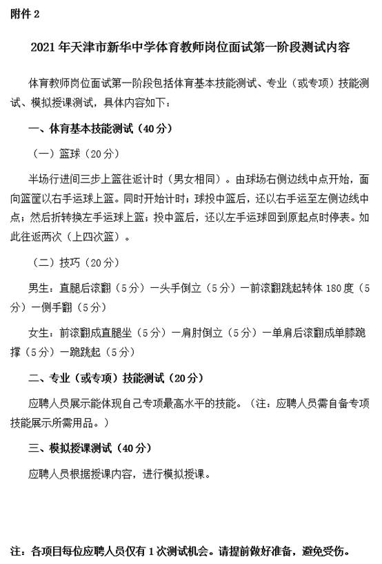 体育教师岗位面试第一阶段测试内容见附件2《2021年天津市新华中学体育教师岗位面试第一阶段测试内容》。