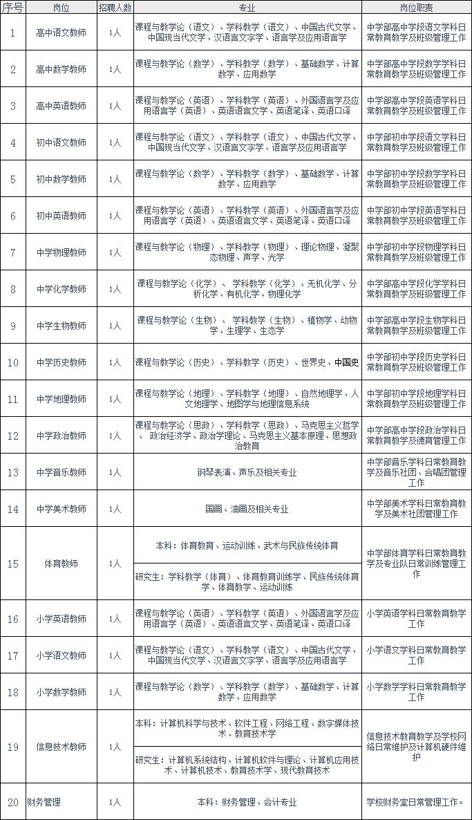 我校2020-2021学年招聘工作坚持按需设岗、按岗招聘的原则;坚持公开公平、竞争择优的原则;坚持德才兼备、任人唯贤的原则。