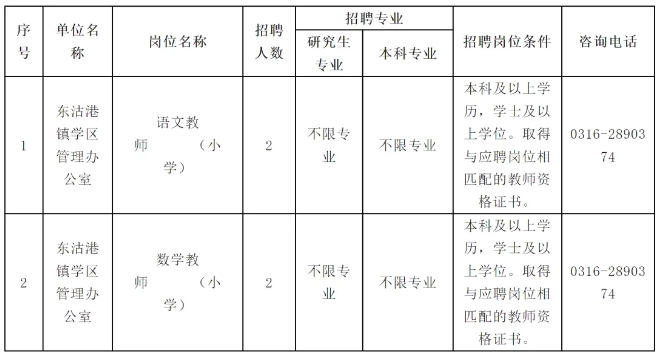 (五)具有岗位要求的相应学历、学位、专业、教师资格证。详见附件《东沽港镇学区合同制教师招聘岗位信息表》。