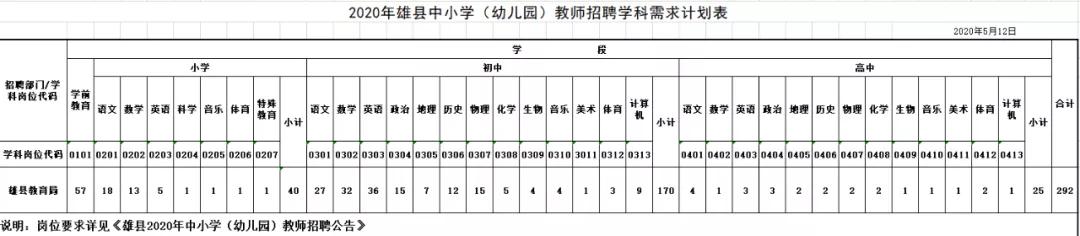 鄚州中学高中部招聘25名;初级中学招聘170名;小学招聘40名;幼儿园招聘57名。详见附件1:《2020年雄县中小学(幼儿园)教师招聘学科需求计划表》;附件2:《2020年雄县中小学(幼儿园)教师招聘岗位分配表》。