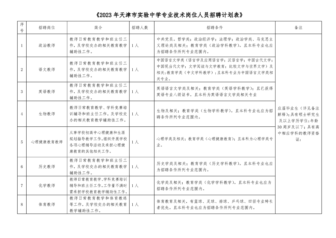 详见《2023年天津市实验中学专业技术岗位人员招聘计划表》