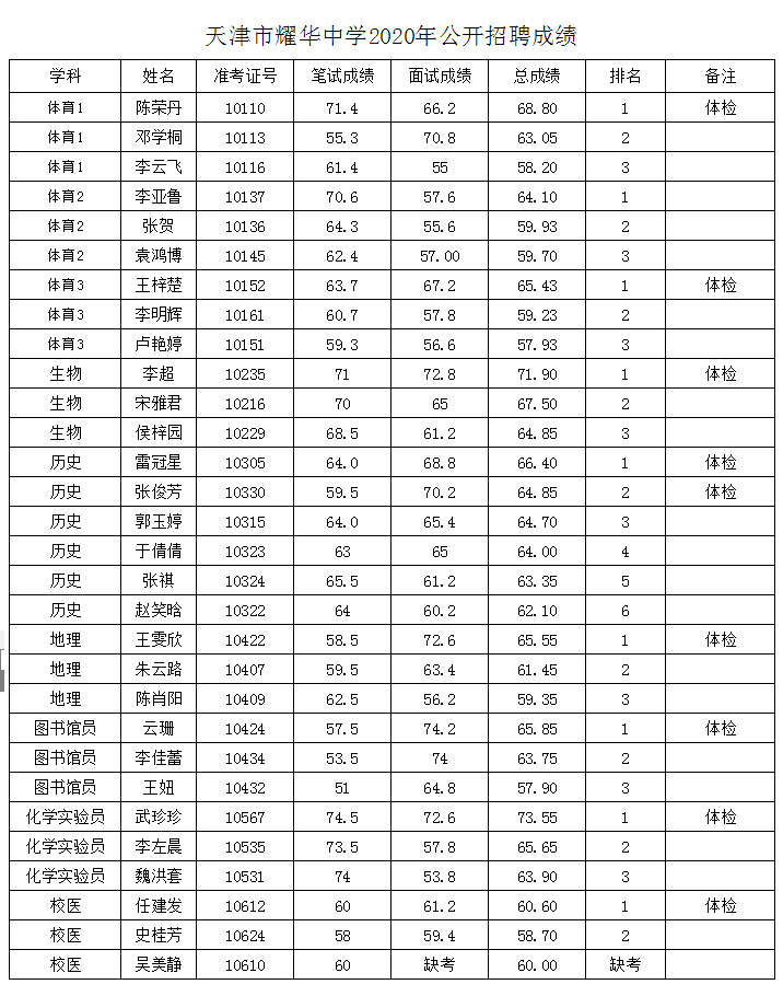 请参加体验的应聘人员到南开医院进行体检,体检后将《健康检查证明书》于2020年2月10日(星期一)上午10:00交到耀华中学人事室。(二校舍二楼209)
