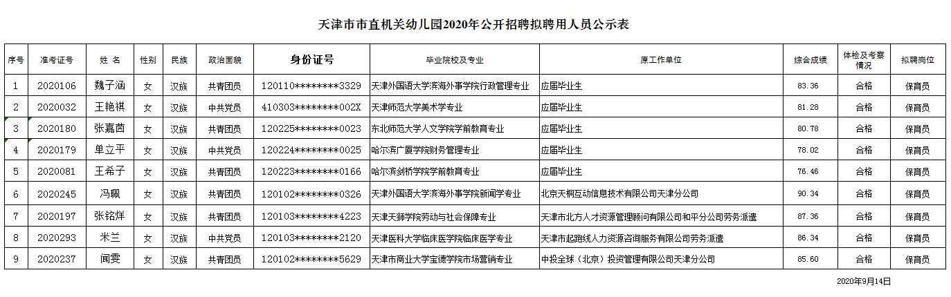 天津市市直机关幼儿园2020年公开招聘工作人员工作,经笔试、面试、体检、考察等环节,共9人符合条件。按照《天津市市直机关幼儿园公开招聘工作方案》现将拟聘用人员予以公示。