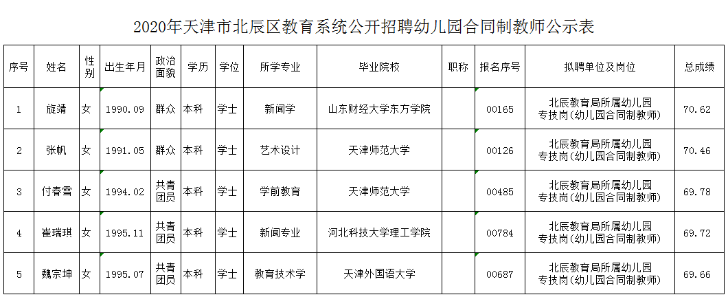 附件:2020年天津市北辰区教育系统公开招聘幼儿园合同制教师公示表