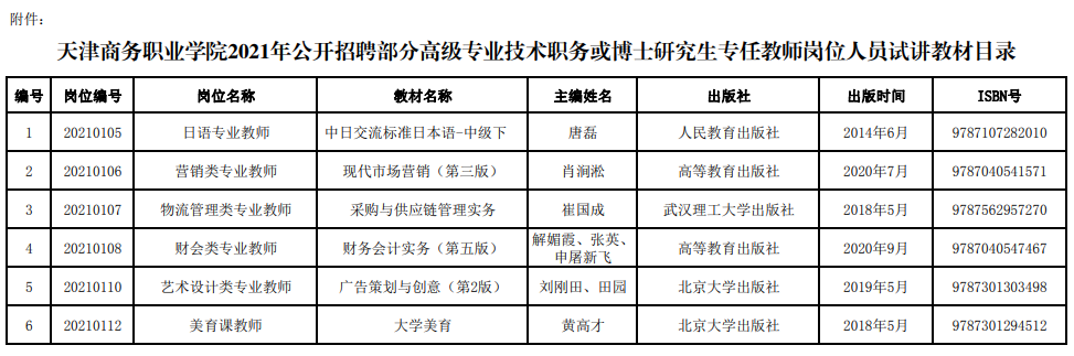 天津商务职业学院2021年公开招聘部分高级专业技术职务或博士研究生专任教师岗位人员考核要求的通知