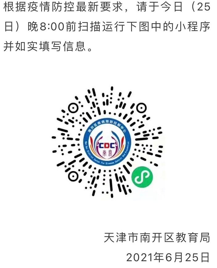 根据疫情防控最新要求,请于今日(25日)晚8:00前扫描运行附件中的小程序并如实填写信息。