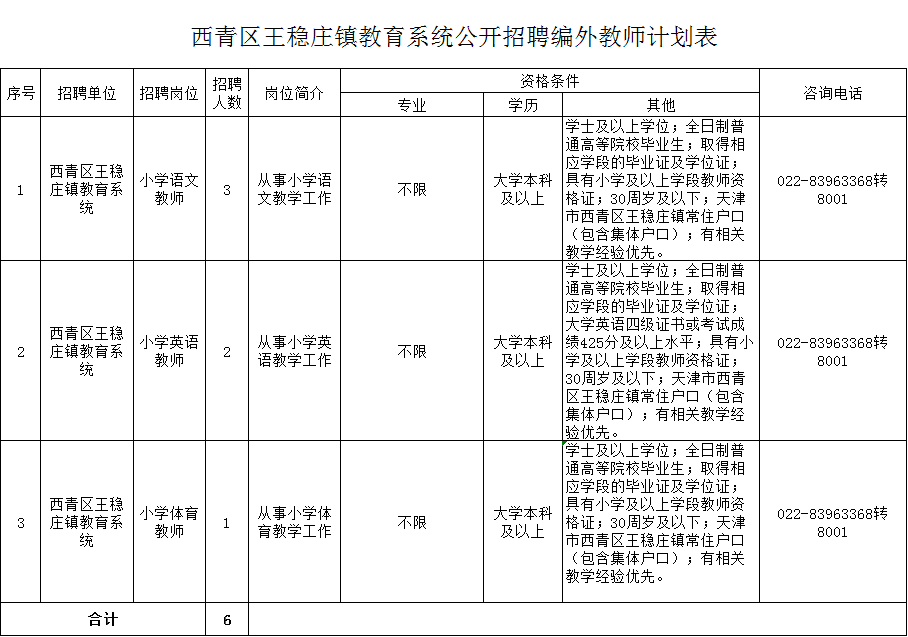 附件:《西青区王稳庄镇教育系统公开招聘编外教师计划表》