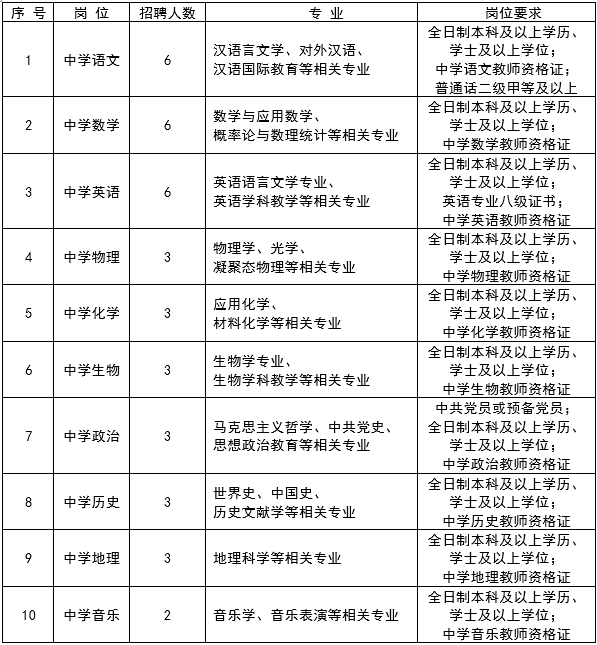 招聘年龄35周岁以下(截至到报名日期),全日制普通高等院校本科学历及以上学历,具有相应资格证书。教育教学经验丰富、有突出业绩者年龄可适当放宽。