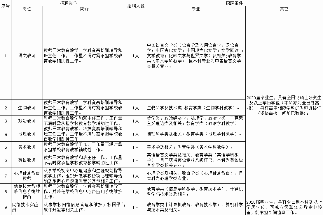 我校2020年拟招聘专业技术人员共9名,其中语文教师、生物教师、政治教师、地理教师、美术教师、英语教师、心理健康教育教师、信息技术教师兼信息系统维护员、网络技术实验员各1人。