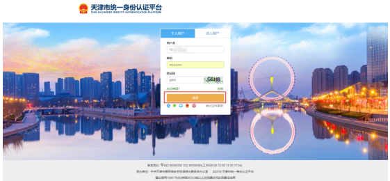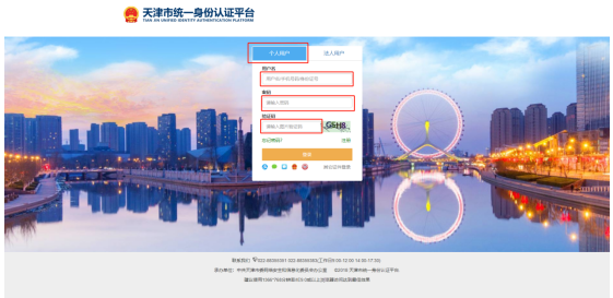 二、进入天津市统一身份认证平台,登录/注册个人用户,输入用户名、密码、验证码