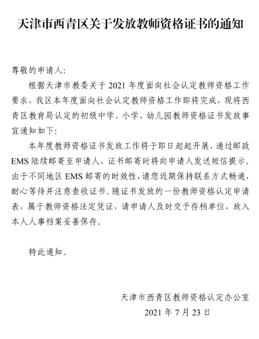 天津市西青区关于发放教师资格证书的通知