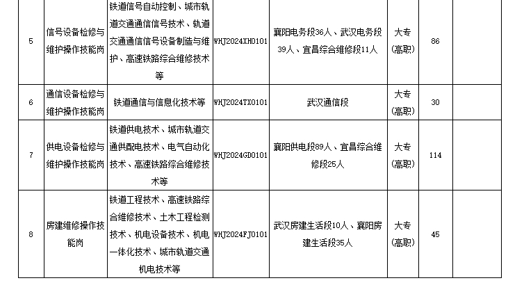 附:武汉局集团公司2024年度招聘高校毕业生岗位信息表