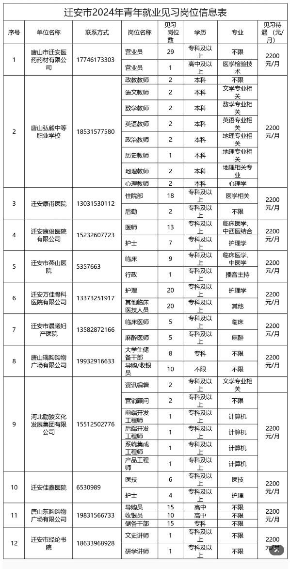 按照迁安市人力资源和社会保障局《关于募集2024年青年就业见习岗位的通知》(迁人社字[2024]24号)文件要求,2024年我市现有12家企业申请就业见习,提供223个就业见习岗位,现就有关事宜通知如下: