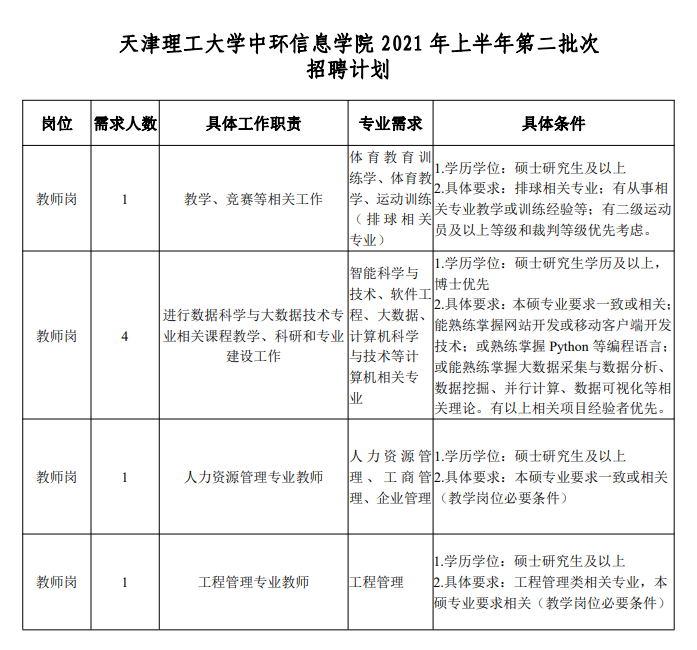 附件:天津理工大学中环信息学院 2021 年上半年第二批次招聘计划