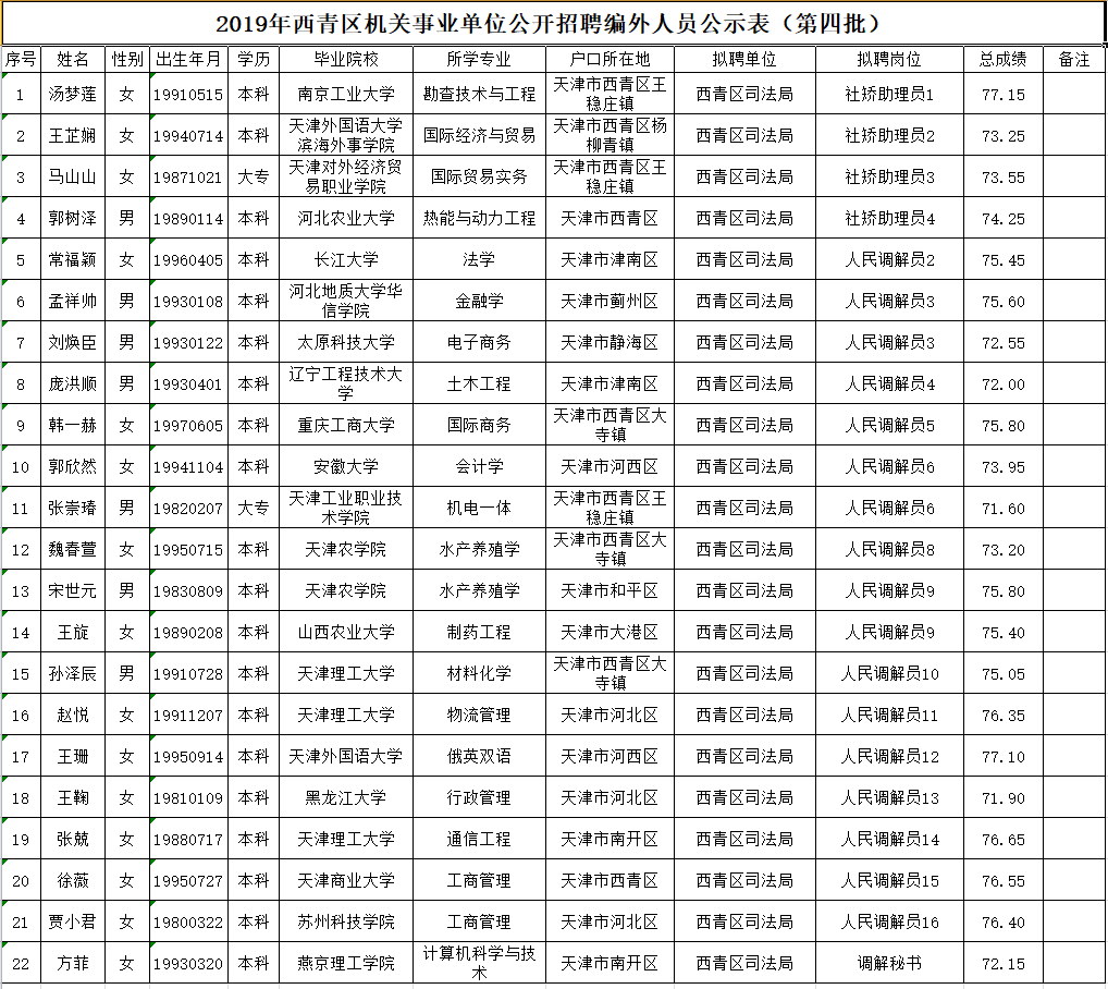 按照《2019年西青区机关事业单位公开招聘编外人员公告》要求,现将第四批拟聘用人员予以公示。