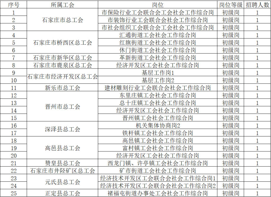 本次拟在全市招聘工会社工25名。用工单位、招聘岗位、招聘数量、岗位等级详见附件《社会招聘岗位信息表》。