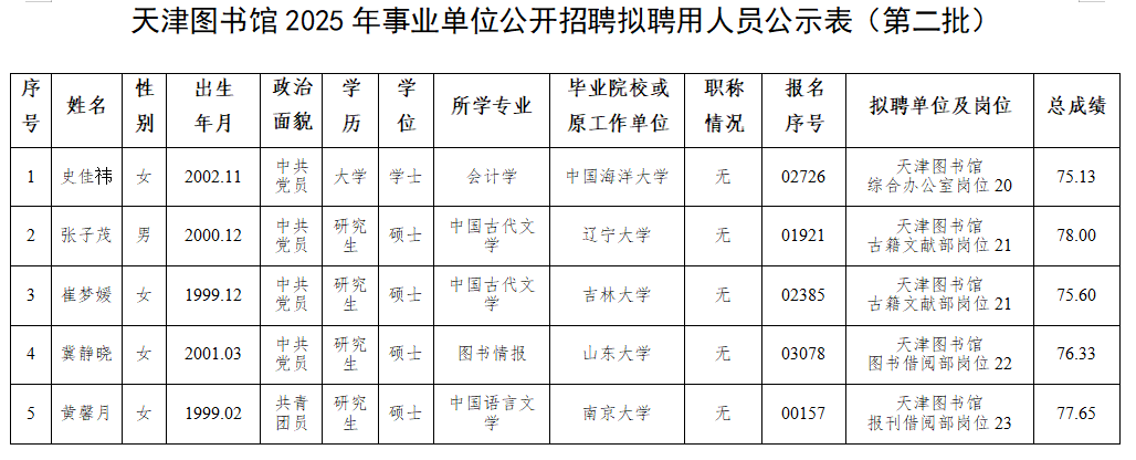 天津图书馆2025年事业单位公开招聘拟聘用人员公示(第二批)