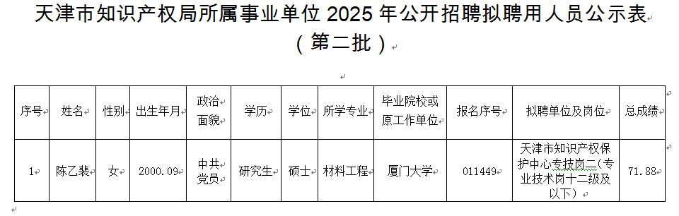 天津市知识产权局2025年事业单位公开招聘拟聘用人员公示(第二批)