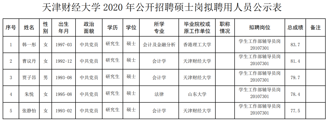 天津财经大学2020年公开招聘硕士岗拟聘用人员公示