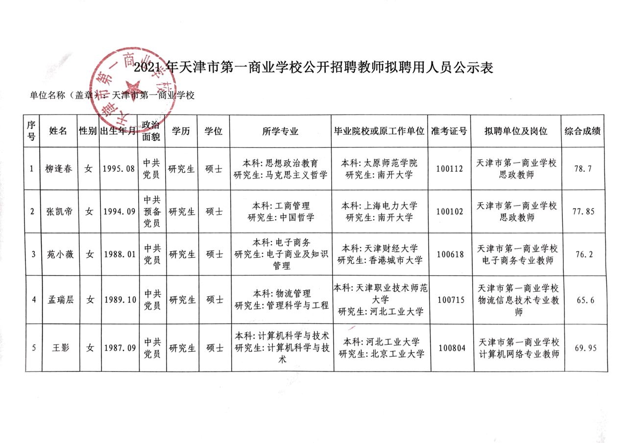 附件:2021年天津市第一商业学校公开招聘拟聘用人员公示表