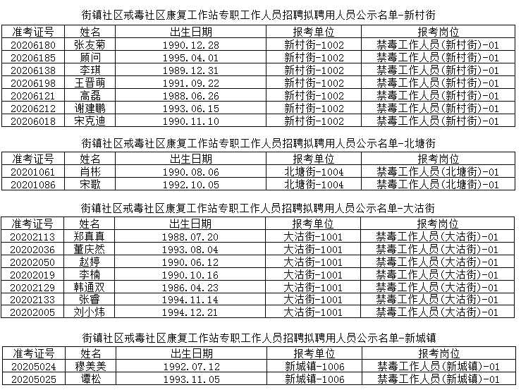 根据《街镇社区戒毒社区康复工作站专职工作人员招聘公告》的要求,经笔试、面试、体检、考察等程序确定新村街、北塘街、大沽街、新城镇张友菊等 17 人为拟聘用人员,现予以公示。(公示名单见附件)