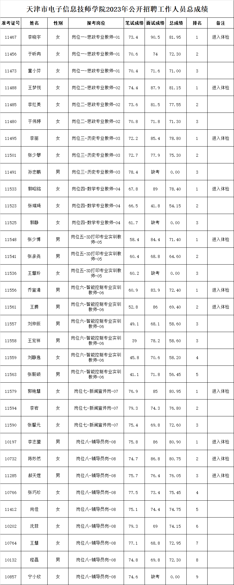 天津市电子信息技师学院天津市仪表无线电工业学校2023年公开招聘工作人员总成绩