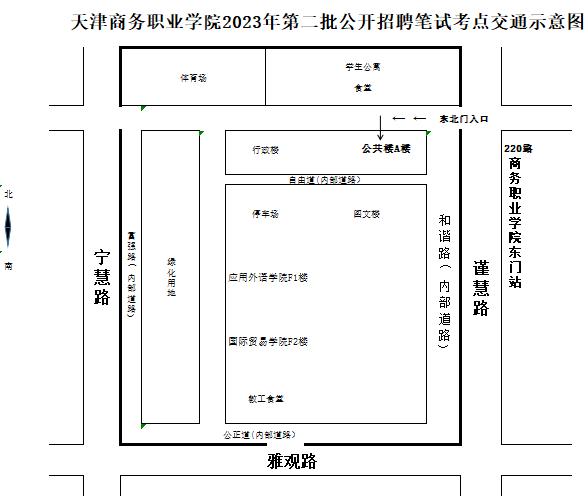 3.考试当天校内无法停放考生车辆,请从东北门(谨慧路、220路公交车商务职业学院东门站下车)步行入校。交通示意图如下:
