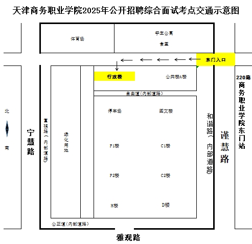 2.综合面试当天校内无法停放考生车辆,请从学校东北门(谨慧路、220路公交车商务职业学院东门站)步行入校。交通示意图如下: