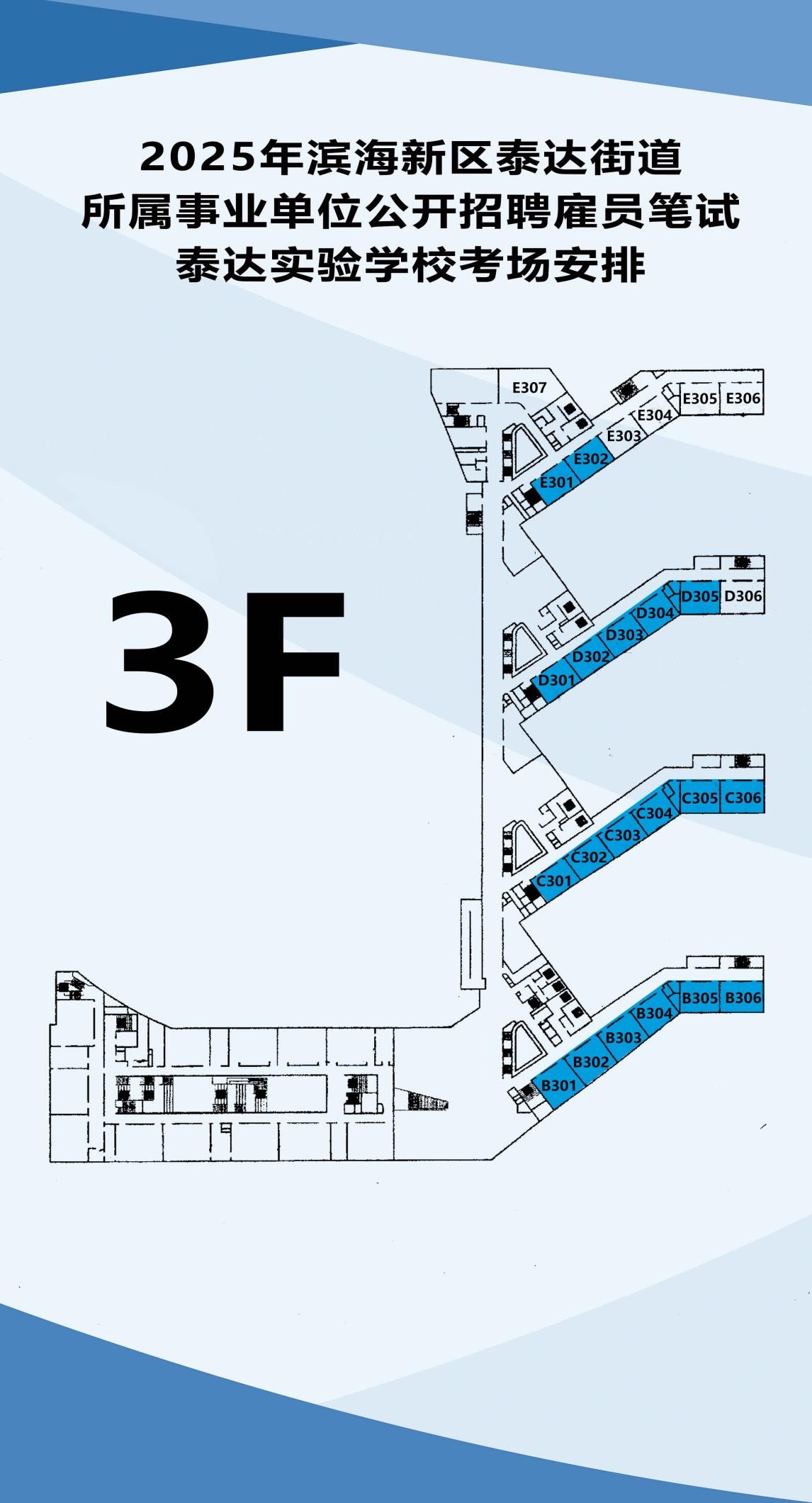 各位参加笔试考生: 以下为2025年滨海新区泰达街道所属事业单位公开招聘雇员笔试考场分布示意图,请各位考生根据自己的报考岗位和准考证号,按时准确到达指定考点参加笔试。 一、考点交通示意图 笔试地点:泰达实验学校西校区(开发区第三大街与太湖西路交口,从太湖西路东南门进入) ![]() 二、考场分布示意图 ![]() ![]() 三、考场安排示意图