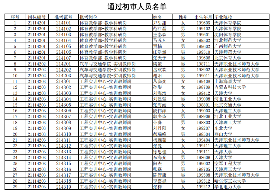天津职业技术师范大学2021年公开招聘硕士层次教学岗位人员通过资格初审人员名单