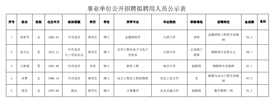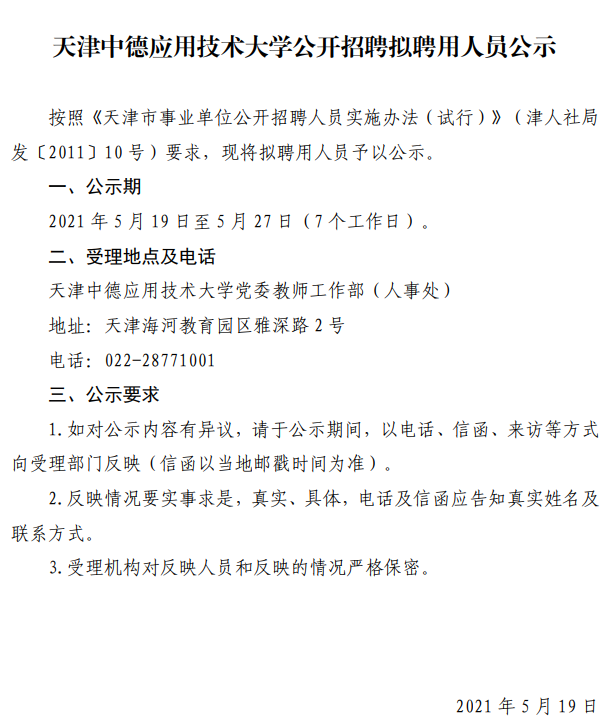 天津中德应用技术大学公开招聘拟聘用人员公示