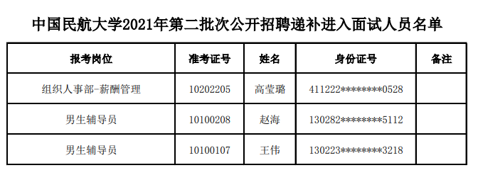 中国民航大学2021年第二批次公开招聘递补进入面试人员名单