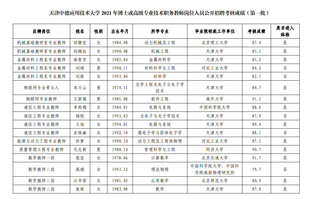 天津中德应用技术大学2021年博士或高级专业技术职务教师岗位人员公开招聘考核成绩(第一批)