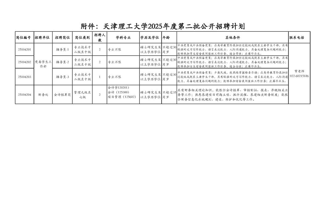 6.具备应聘岗位所需的资格条件:具体岗位及专业、学历、学位等要求详见《附件:天津理工大学2025年度第二批公开招聘计划》;