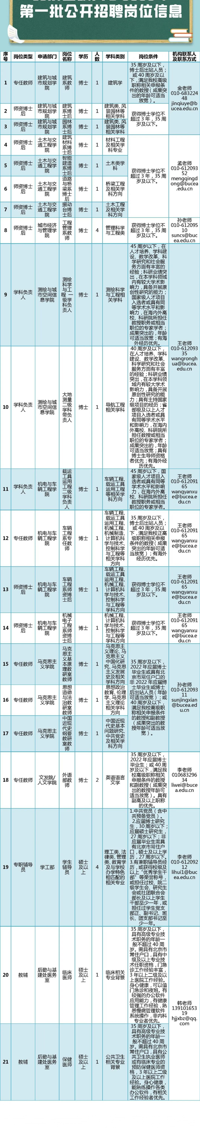 北京建筑大学2022年第一批公开招聘学科负责人、专任教师、师资博士后、教辅、专职辅导员共28人,报名截止日期为2022年3月6日。有意者赶快行动吧!
