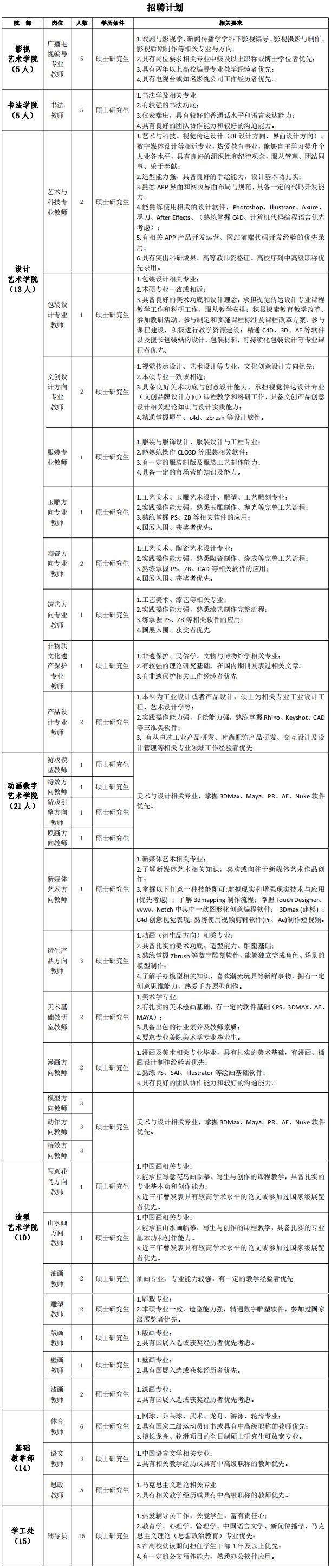河北美术学院是经教育部批准设立的民办全日制普通本科艺术类高校。学校始建于2002年,2015年获批学士学位授予权,2016年获批硕士学位授予立项建设单位,2019年通过了国务院教育督导委员会本科教学工作合格评估。设有造型艺术学院、书法学院、建筑与艺术设计学院、设计艺术学院、影视艺术学院、动画数字艺术学院、国际教育学院等7个二级学院,在校生20180人。学校主动适应区域经济和社会发展对艺术人才的需求,不断优化专业布局。现有本科专业34个。其中,环境设计获评河北省重点发展学科;书法学、环境设计、数字媒体艺术、艺术与科技、动画、广播电视编导、雕塑等7个专业入选河北省一流专业建设点,艺术设计被列为省级专业综合改革试点。根据我校教育教学需要,结合2022年招聘教师计划和岗位需求情况,拟面向社会公开招聘专业教师68名,辅导员15名。现将招聘有关具体事宜公告如下: