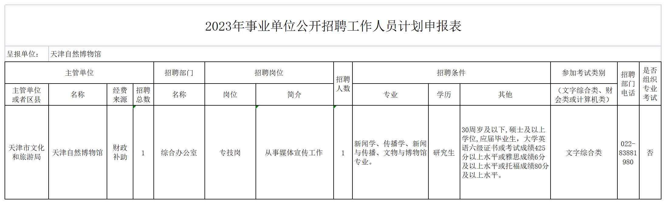 天津自然博物馆2023年事业单位公开招聘工作人员方案