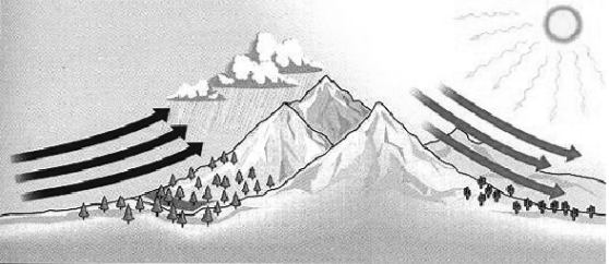 3.【答案】C。解析:地形雨指的是当潮湿的气团前进时,遇到高山阻挡,气流被迫缓慢上升,引起绝热降温,发生凝结而形成的降雨。地形雨多降在迎风面的山坡(迎风坡)上,背风坡面则因空气下沉引起绝热增温,反使云量消减,降雨减少。地形雨给迎风坡带来较多降水,从而为植被的生长提供丰富的水源,往往导致迎风坡植被茂盛。地形雨如不与对流雨或气旋雨结合,雨势一般不会很强,持续时间不会很长。因此,C项说法错误,本题答案选C。