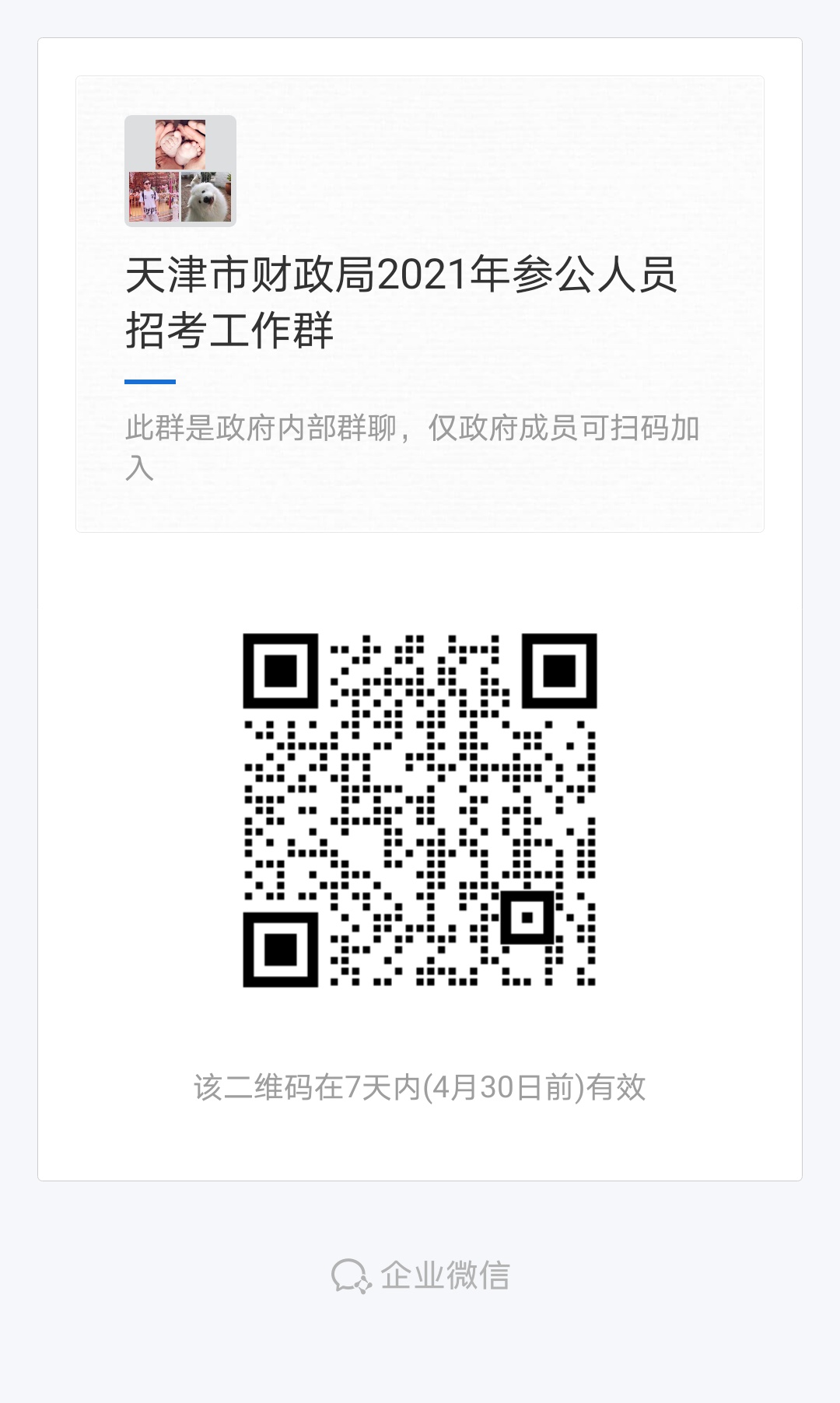 2请参加资格复审的考生通过扫描附2二维码加入天津市财政局2021年参公管理工作人员招考工作群,入群后请将备注名修改为本人姓名+报名序号。考录期间,请各位考生务必保持手机通讯畅通。