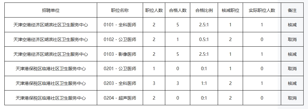 天津港保税区2024年度社区卫生服务中心派遣制工作人员补充招聘职位核减、取消公示