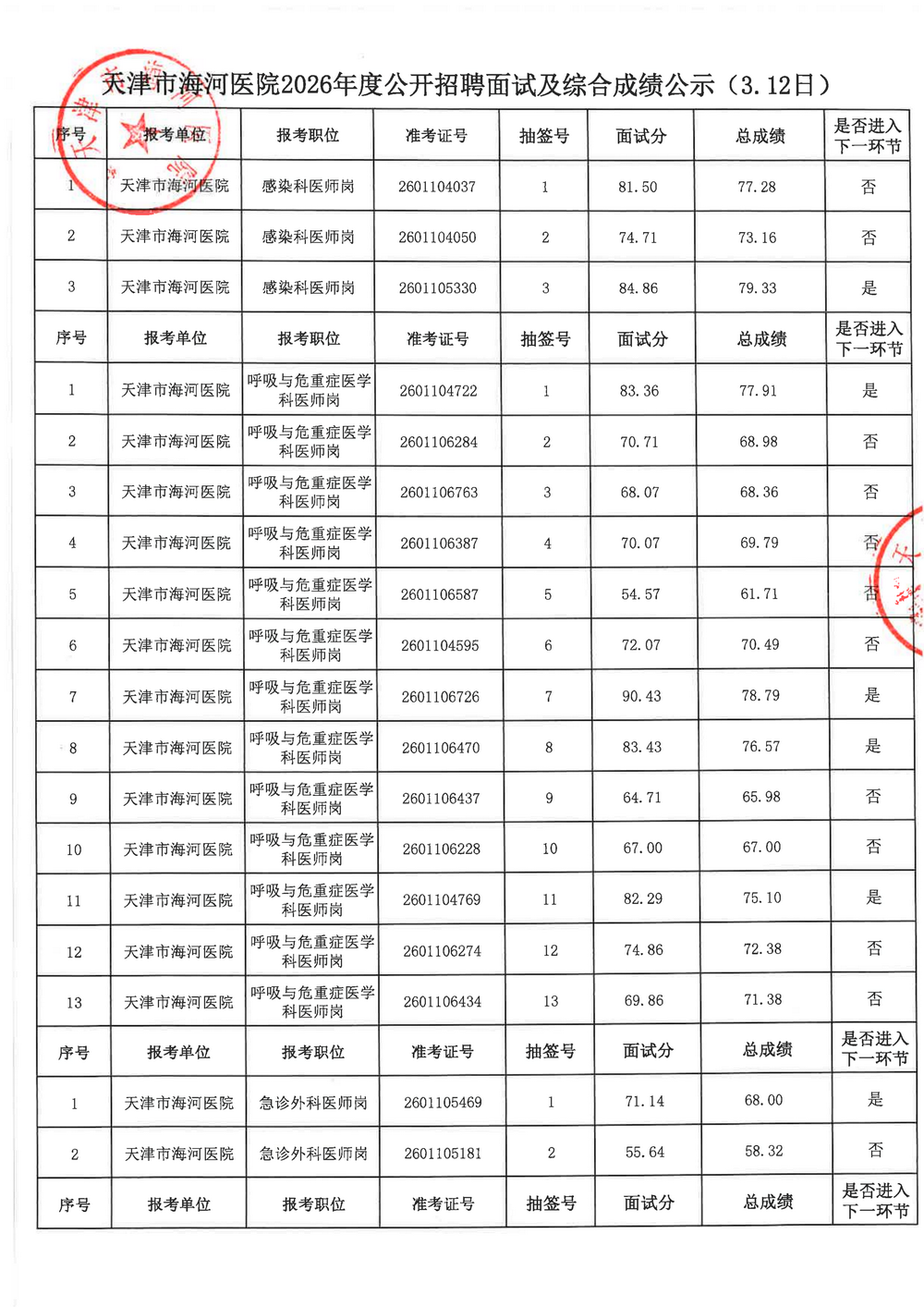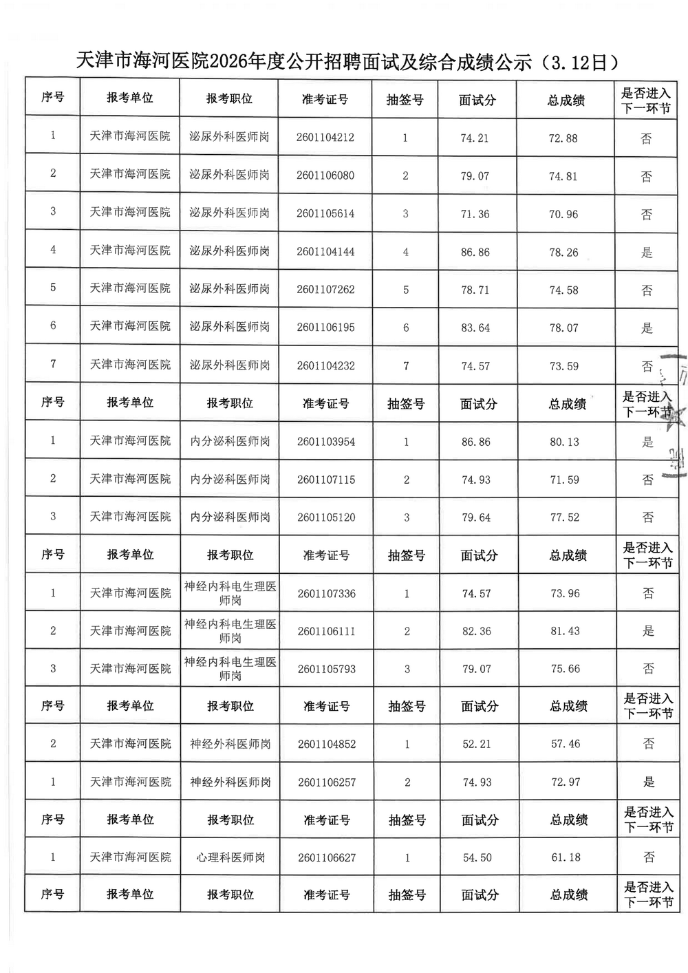 现将天津市海河医院2026年度公开招聘面试及综合成绩公示如下,公示期:2026年3月18日-3月26日。如有异议,请在公示期内以各种形式向天津市海河医院人事科提出。