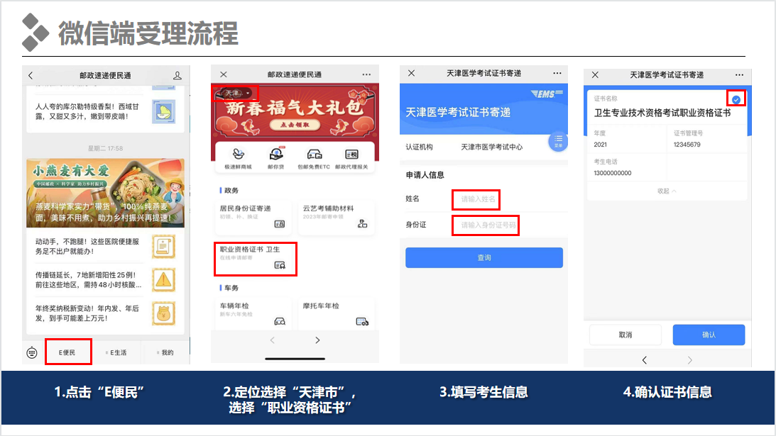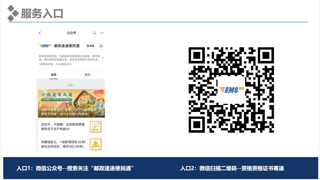 1.领取办法。 2023年2月27日~4月30日通过微信关注公众号“邮政速递便民通”,进入职业资格证书模块办理证书寄递。在完成信息填写、身份验证、邮费缴纳后,邮政部门于每周第一个工作日,将上一周可邮寄的证书通过中国邮政“政务速递”方式统一寄出。